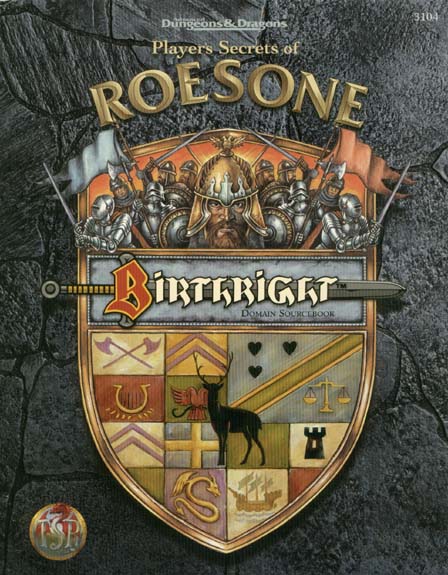 your shoulders. This package includes: A full-color, eight-page foldout cover containing detailed maps of the domain and important locations within it. Facts about the history, geography, and economy of Roesone. A summary of how the government works, and the resources the regent can use to maintain control of the realm. Descriptions of the major NPCs in Roesone, friend and foe alike. Rumors to keep the regent on the alert, and royal secrets to help keep enemies at bay. This BIRTHRIGHT domain sourcebook is designed for players who want to take the role of Baron Roesone, the warrior regent of the land. It may also be used by players playing nobles, servants to the Baron, or adventurers of Roesone. |