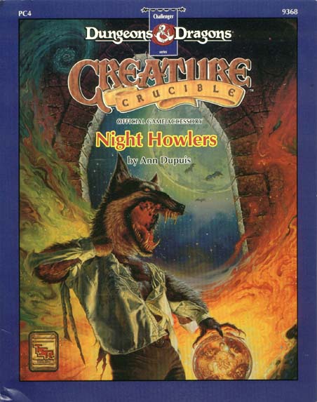 Night Howlers is the fourth book in the CREATURE CRUCIBLE series, which explores new character types for the D&D game. Wheter the referee wants to add one or two were-creatures to the party line-up, base a whole series of adventures around the were-creatures' struggle for survival, or add some very special encounters for the players, this book will provide hours of unique playing experience. Ten different types of lycanthropes, including werewolves, wererats, werefoxes, werebears, and others; Two seperate booklets, one with player information and one with campaign details; A fully detailed land of werewolves, the Valley of the Wolves, located in the Known World campaign setting. New magical items specially tailored to the needs of lycanthropes. Information about important non-player characters; a large, full-color map; and three exciting adventures. Fully adapatable to the ADVANCED DUNGEONS & DRAGONS 2nd Edition Game. Don't miss the other CREATURE CRUCIBLE products: PC1, Tall Tales of the Wee Folk; PC2, Top Ballista; and PC3, The Sea People. |