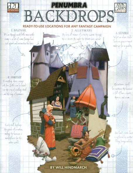 Item Code: #AG3210 Title: Backdrops Type: Accessory Author: Will Hindmarch Published: 2002 Publisher: Atlas Games Format: 32-page book |