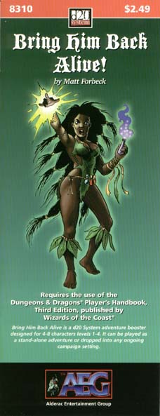 Item Code: #AEG8310 Title: Bring Him Back Alive! Type: Adventure For: 4-8 characters, levels 1-4 Author: Matt Forbeck Published: 2001 Publisher: Alderac Entertainment Group Format: 16-page book |