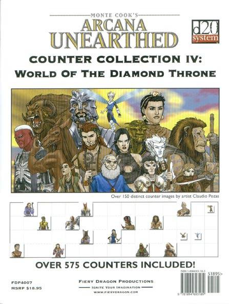 Item Code: #FDP4007 Title: Counter Collection IV: World of the Diamond Throne Type: Accessory Published: 2003 Publisher: Fiery Dragon Productions Format: 8-page book, 11 cardstock counter pages (599 counters total) |