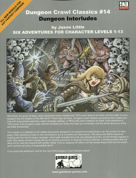 Item Code: #GMG5013 Title: Dungeon Crawl Classics #14 Type: Adventure For: 1st - 13th level characters Author: Jason Little Published: 2005 Publisher: Goodman Games Format: 88-page perfect-bound book |
