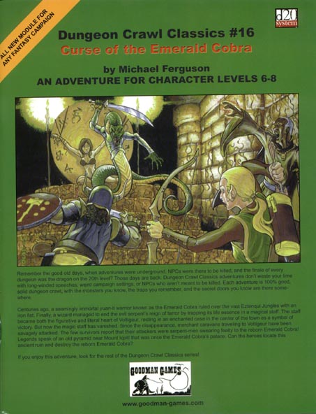 Item Code: #GMG5015 Title: Dungeon Crawl Classics #16: Curse of the Emerald Cobra Type: Adventure For: 6th - 8th level characters Author: Michael Ferguson Published: 2005 Publisher: Goodman Games Format: 48-page book |
