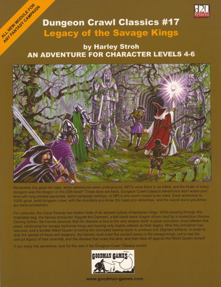 Item Code: #GMG5016 Title: Dungeon Crawl Classics #17: Legacy of the Savage Kings Type: Adventure For: 4-6 characters levels 4th-6th Author: Harley Stroh Published: 2005 Publisher: Goodman Games Format: 40-page book with cover, cardboard backer |