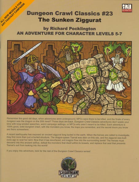 Item Code: #GMG5022 Title: Dungeon Crawl Classics #23: The Sunken Ziggurat Type: Adventure For: 4-6 characters, levels 5-7 Author: Richard Pocklington Published: 2005 Publisher: Goodman Games Format: 40-page book |