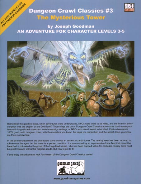 Item Code: #GMG5002 Title: Dungeon Crawl Classics #3: The Mysterious Tower Type: Adventure For: 4-6 characters, levels 3-5 Author: Joseph Goodman Published: 2003 Publisher: Goodman Games Format: 32-page book |