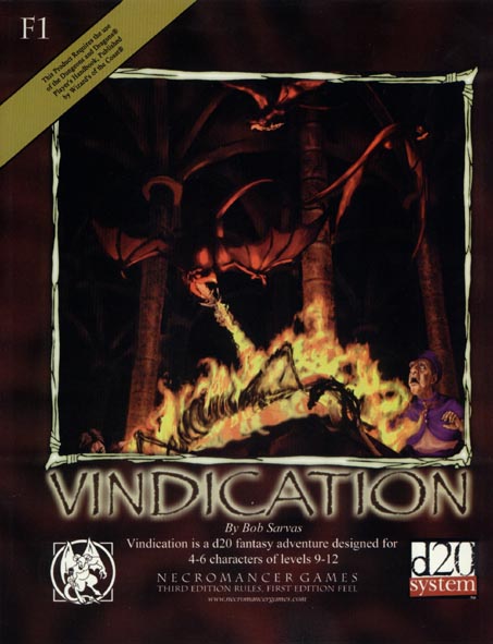 Item Code: #TLGNGF1 (F1) Title: Vindication Type: Adventure For: 4 - 6 characters, 9th - 12th level Author: Bob Sarvas Published: 2004 Publisher: Necromancer Games Format: 120-page perfect-bound book |
