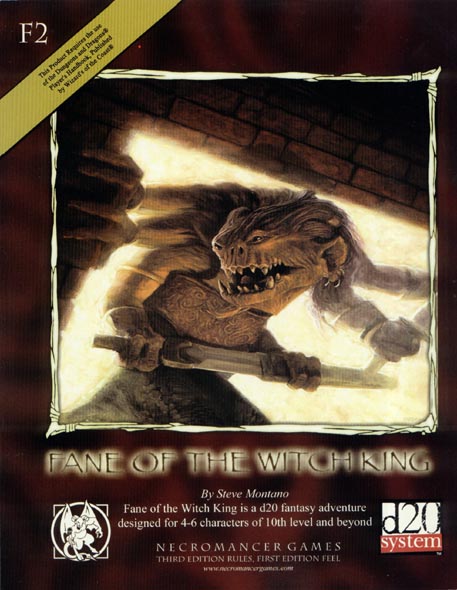 Item Code: #TLGNGF2 (F2) Title: Fane of the Witch King Type: Adventure For: 4 - 6 characters, 10th level or higher Author: Steve Montano Published: 2004 Publisher: Necromancer Games Format: 72-page perfect-bound book |