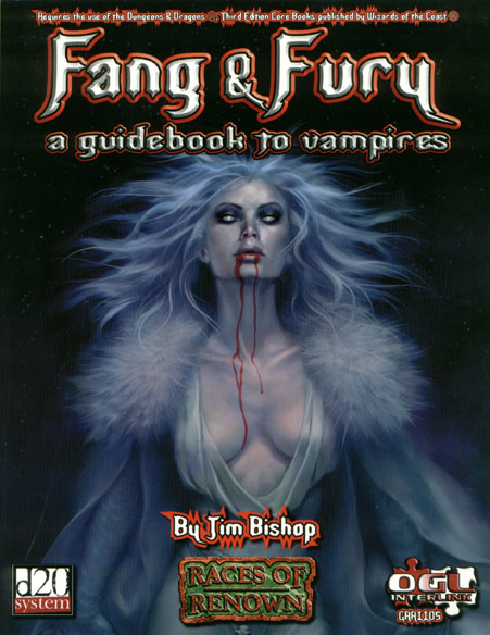 Item Code: #GRR1105 Title: Fang & Fury: A Guidebook to Vampires Type: Accessory Author: Jim Bishop Published: 2003 Publisher: Green Ronin Publishing Format: 80-page perfect-bound book |