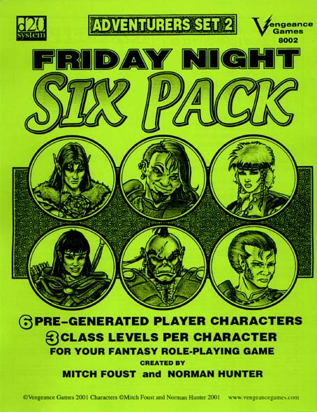 Item Code: #VNG8002 Title: Friday Night Six Pack: Adventurers Set 2 Type: Accessory Author: Mitch Foust and Norman Hunter Published: 2001 Publisher: Vengeance Games Format: 34 loose pages, ziplock bag |