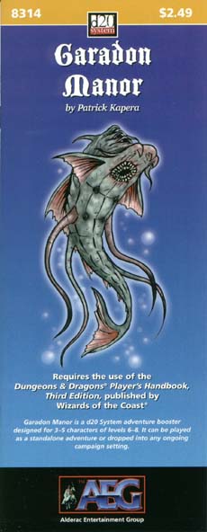 Item Code: #AEG8314 Title: Garadon Manor Type: Adventure For: 3-5 characters, levels 6-8 Author: Patrick Kapera Published: 2001 Publisher: Alderac Entertainment Group Format: 16-page book |
