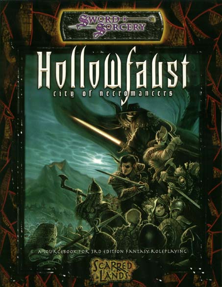 Sword and Sorcery books are published under the Open Gaming License and are 100% compatible with 3rd edition rules. In the shadow of a dormant volcano crouched the dead city of Sumara. Wandering necromancers rediscovered it in the wake of the Divine War, and from the bones of that slain nation, the wizards fashioned a new realm: Hollowfaust, City of the Necromancers. Today, this city-state grows and prospers, defended by legions of undead warriors and ruled by a secret society of powerful spellcasters. On the surface, there exists a curious culture that embraces both the joy of life and the inevitability of death, but deep below, in tunnels beneath the city, the necromancers delve into the secrets of mortality and the undead. Welcome, then, to Hollowfaust - one of the strangest cities in all of Ghelspad. Enjoy your visit. And don't die. |