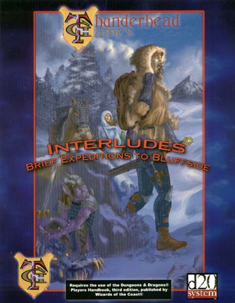 Item Code: #TGS1004 Title: Interludes: Brief Expeditions to Bluffside Type: Accessory Author: Jeffrey Quinn Published: 2002 Publisher: Thunderhead Games Format: 64-page perfect-bound book |