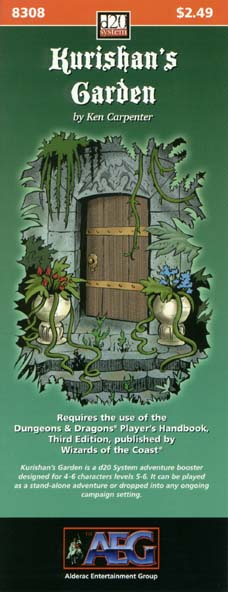 Item Code: #AEG8308 Title: Kurishan's Garden Type: Adventure For: 4-6 characters, levels 5-6 Author: Ken Carpenter Published: 2000 Publisher: Alderac Entertainment Group Format: 16-page book |