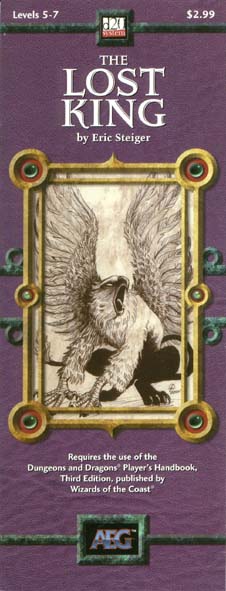 Item Code: #AEG8329 Title: The Lost King Type: Adventure For: 5th-7th level characters Author: Eric Steiger Published: 2001 Publisher: Alderac Entertainment Group Format: 16-page book |