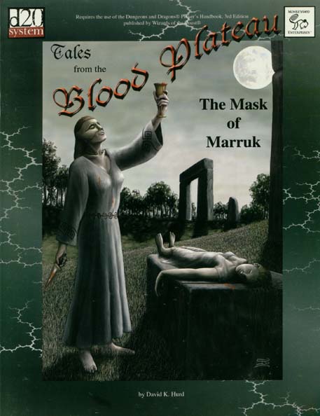 Item Code: #MKY1102 Title: Tales from the Blood Plateau: The Mask of Marruk Type: Adventure For: 5th-7th level characters Author: David K. Hurd Published: 2001 Publisher: MonkeyGod Enterprises Format: 28-page book |