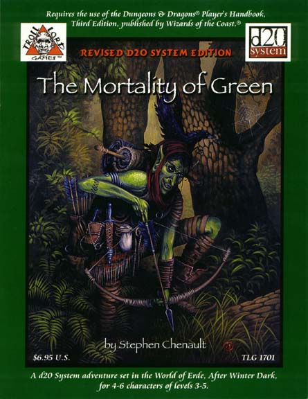 Item Code: #TLG1701 Title: The Mortality of Green Type: Adventure For: 4-6 characters, levels 3-5 Author: Stephen Chenault Published: 2001 Publisher: Troll Lord Games Format: 24-page book |