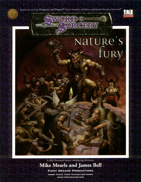 Item Code: #WW16000 Title: Nature's Fury Type: Adventure For: 4 characters, levels 5-6 Author: Mike Mearls and James Bell Published: 2001 Publisher: Fiery Dragon Productions, Inc. Format: 40-page book, 1 sheet of cardstock counters (47 total) |