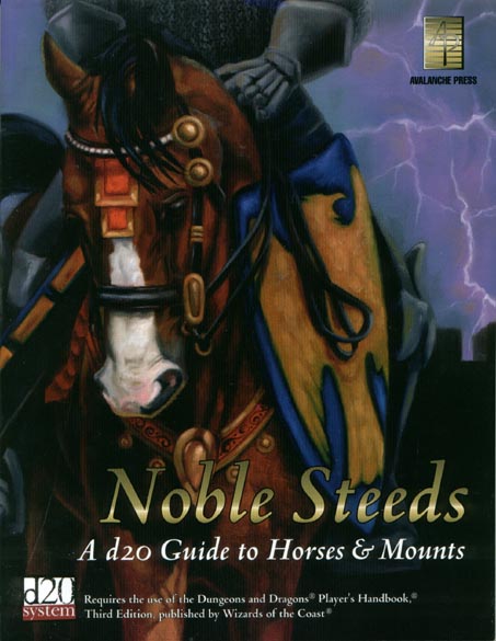 Item Code: #APL920 Title: Noble Steeds: A d20 Guide to Horses & Mounts Type: Accessory Author: Ree Soesbee Published: 2002 Publisher: Avalanche Press LTD Format: 64-page perfect-bound book |