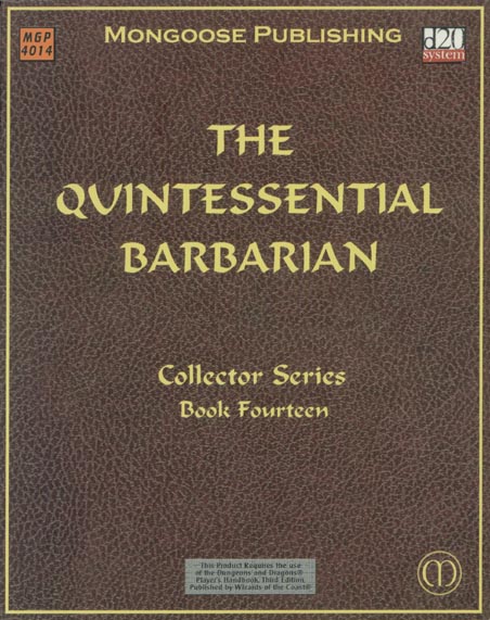 Item Code: #MGP4014 Title: The Quintessential Barbarian Type: Accessory Author: Robert Schwalb Published: 2003 Publisher: Mongoose Publishing Format: 128-page perfect-bound book |
