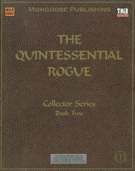 The steely-eyed assassin clutching a serated dagger that drips with fresh venom. The grey bearded old dwarf prospector with an eye for traps and a nose for trouble. The halfling businessman, ready to sell his own daughter for the right price and willing to slip his dagger between your ribs if you turn your back on him. The high society darling, belle of the ball, but at the stroke of midnight this lady turns into the masked Rooftop Marauder. All these are examples of rogues, the most flexible class available in the core d20 rules. The Quintessential Rogue is a sourcebook that greatly expands the gaming horizons of this class. Rogues have always relied on the wits and resourcefulness, and now find rules for pursuing such roguish behaviours as inventing a new poison, setting a trap to catch your enemies, or founding a criminal empire that grows to span an entire continent.