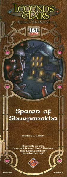 Item Code: #DD24 Title: Spawn of Shurpanakha Type: Adventure For: 4-6 characters, levels 10-12 Author: Mark L. Chance Published: 2001 Publisher: Fantasy Flight Games Format: 16-page book |
