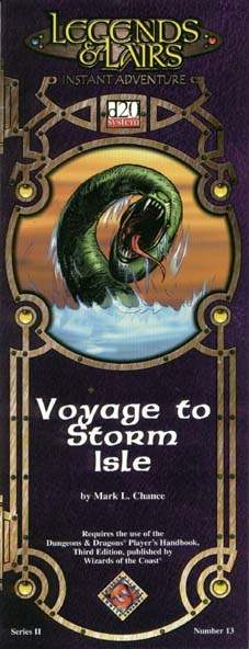 Item Code: #DD13 Title: Voyage to Storm Isle Type: Adventure For: 4-6 characters, levels 3-5 Author: Mark L. Chance Published: 2001 Publisher: Fantasy Flight Games Format: 16-page book |