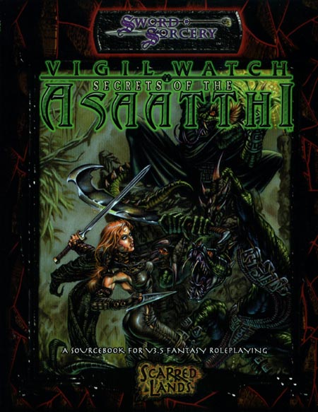 Cold. Cunning. Masters of sword and spell. Such words describe the serpentfolk called asaatthi, yet still little is known of their ancient history, their rich culture, their once-influential role in the world... and their plans for the future. This second volume in the Vigil Watch series for the Scarred Lands explores the mysterious asaath race. Also discover tips for using these serpentfolk in any d20 campaign, from details on the creatures' culture and lairs to unique magic and prestige classes. Sword and Sorcery books are published under the Open Game License and are 100% compatible with revised 3rd Edition rules and the d20 system. |