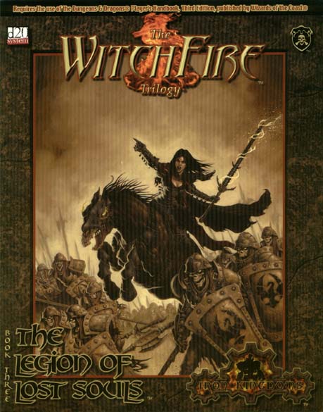 As Raelthorne chokes the life from Corvis with his army of the strange and foreign Skorne, our heroes become the last chance to stop the Exile's dark plan. Hope lies in a wicked blade, an ancient legend, and a psychotic adolescent girl who doesn't know when to quit. This is the final hour. This is the day of days. Lock and load... Return to the IRON KINGDOMS in the third book of this award winning D20 adventure series. Experience a world of full metal fantasy, where the embers of ancient conflict fuel the fire in which heroes are forged. Book Three: The Legion of Lost Souls concludes the Witchfire Trilogy and marches the IRON KINGDOMS towards a date with destiny. Part adventure, part sourcebook, The Legion of Lost Souls will provide you with weeks of campaign material including new monsters, magical creations and intriguing characters. Haven't played through Book I or II of the Trilogy? No problem. This adventure can be dropped into any fantasy D20 campaign. An adventure for characters of 5th-7th level |