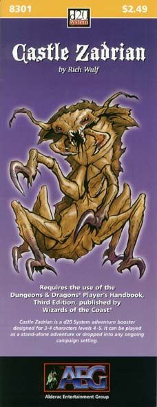 Item Code: #AEG8301 Title: Castle Zadrian Type: Adventure For: 3-4 characters, levels 4-5 Author: Rich Wulf Published: 2000 Publisher: Alderac Entertainment Group Format: 16-page book |