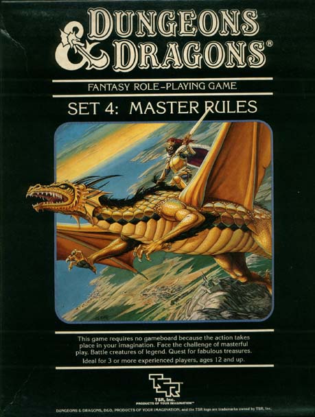 THIS IS SET #4. TO BE ABLE TO PLAY THE MASTER RULES, YOU SHOULD ALREADY HAVE PLAYED D&D BASIC, EXPERT, AND COMPANION RULES. FOR CHARACTER LEVELS 26-36 Master DM's Book - New rules for anti-magic effects, mystics, artifacts, and campaigning. Plus new treasures and monsters, including creatures from other planes. |