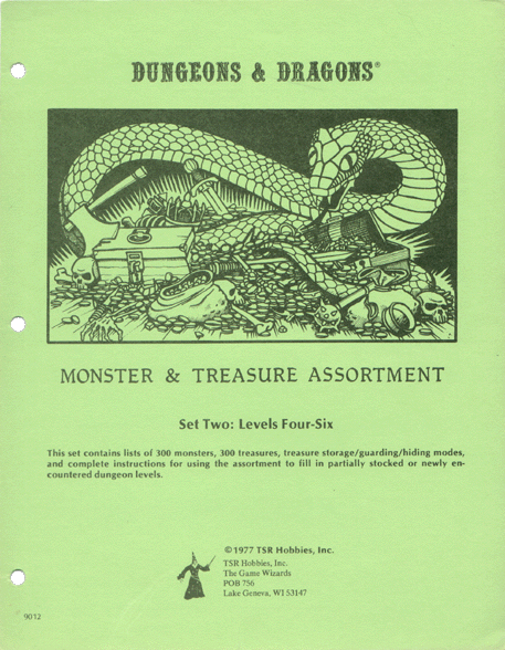 Item Code:9012 Title: Monster & Treasure Assortment Set Two: Levels Four - Six Type: Acessory Published: 1977 Format: 8 loose card-stock sheets |