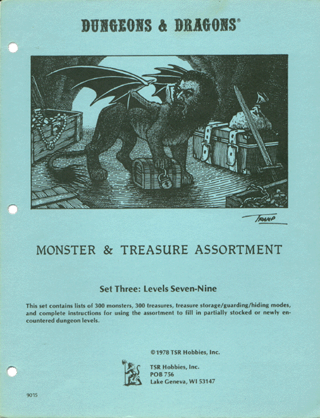 Item Code: #9015 Title: Monster & Treasure Assortment Set Three: Levels Seven - Nine Type: Accessory Published: 1978 Format: 8 loose three-hole punched card-stock pages |