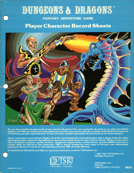 Item Code:9037 Title: Player Character Record Sheets Type: Accessory Published: 1981 Format: 32-page book |