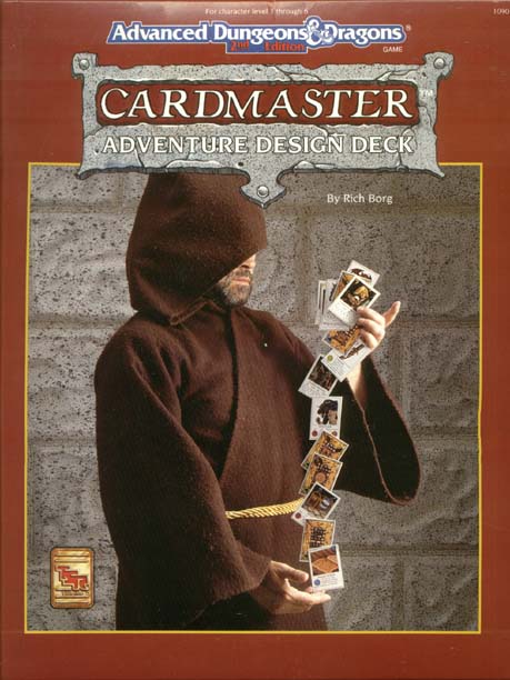 Item Code: #1090 Title: Cardmaster Adventure Design Deck Type: Accessory Author: Rich Borg Published: 1993 Format: 16-page book, 3 cardstock accessory sheets, "Fastplay Adventures" reference sheet, 216 cards, 6 dice, cardstock tray |