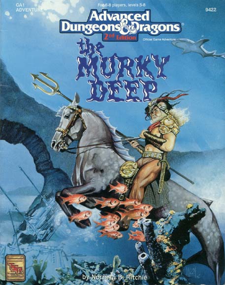 Item Code: #9422 (GA1) Title: The Murky Deep Type: Adventure Author: Norman B. Ritchie Published: 1993 Format: 32 page book Comments: The lgendary coastal city of Carsall existed two centuries ago - before it vanished beneath the waves, reputedly at the hands of an angry sea god. Stories of the city and tales of fabulous artifacts originating from Carsall still abound. Now, the clerics of a seaside town have proven that some unusual items are indeed from the legendary city - and two priests involved in the process, as well as a mysterious stranger, are missing. Are player characters willing to risk life and breath beneath the water to find the lost city? Does the city truly exist, or is the story simply a hoax put forth by crooked fishermen? Take the plunge - explore The Murky Deep. |
