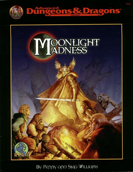 throat. Your clothes shred and tear as your Other Self breaks free.... Moonlight Madness follows the exploits of six unlucky heroes trying to free themselves of the curse of lycanthropy while evading a full-scale werewolf hunt lead by a crusading paladin and his doughty army. Hermits, sphinxes, dinosaurs, pixies, Amazons, bandits, and a friendly game of "Dwarfenball" are only a few of the challenges that stand between the heroes and the cure they seek. Will they reach the Hermitage on the Lake in time, or succumb to Moonlight Madness? |