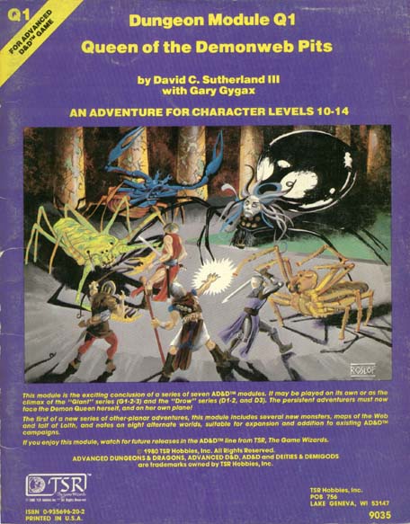 Item Code: #9035 (Q1) Title: Queen of the Demonweb Pits Type: Adventure Author: David C. Sutherland III with Gary Gygax Published: 1980 Format: 32-page book w/double-cover |