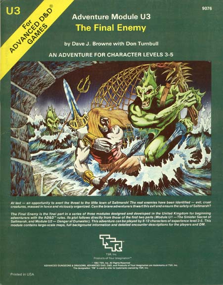 The Final Enemy is the final part in a series of three modules designed and developed in the United Kingdom for beginning adventurers with the AD&D rules. Its plot follows directly from those of the first two parts (Module U1 - The Sinister Secret of Saltmarsh, and Module U2 - Danger at Dunwater). This adventure can be played by 8-12 characters of experience level 3-5. This module contains large- scale maps, full background information and detailed encounter descriptions for the players and DM. |