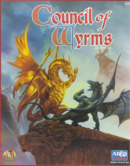 Item Code: #1107 Title: Council of Wyrms Type: Accessory Author: Bill Slavicsek Published: 1994 Format: 3 64-page books, 12 accessory sheets, 3 fold-out maps |