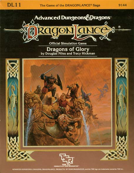 Item Code: #9144 (DL11) Title: Dragons of Glory Author: Douglas Niles and Tracy Hickman Type: Accessory Published: 1985 Format: 16-page book, 8-page book, heavy cardstock cover, 2 fold-out maps, 2 sheets of heavy cardstock counters (400 counters total), ziploc bag |