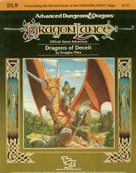 Item Code: #9137 (DL9) Title: Dragons of Deceit Author: Douglas Niles Type: Adventure Published: 1985 Format: 48-page book w/tri-fold cover, heavy cardstock sheet of counters (28 total) |