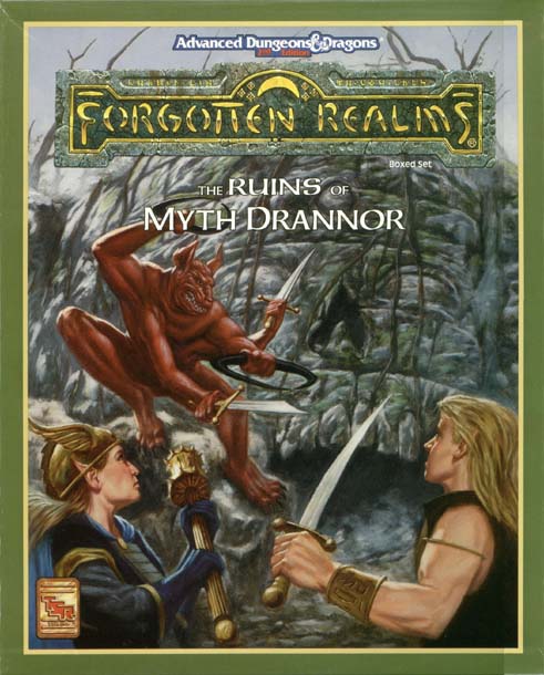 MYTH DRANNOR, city of glory. We shall not see its like again. PERHAPS YOU'VE HEARD ITS SHINING STORY...of a time when elves and dwarves, gnomes and halflings and men lived and loved together, striving to create beauty and right wrongs. Magic was brighter then, in the City of Song. Folk were richer then, in the City of Wonder. Once this proud city stood as the highest jewel in the glittering crown of civilization. THERE CAME A DAY when it was overwhelmed by evil, thrown down, despoiled, and left a ruin in the heart of its encircling wood, as all things of beauty are. Evil spawned and crawled there, and the elves kept watch around it, that evil might not spread. Centuries passed, but the tales let few forget the powerful magic, the great treasure - and the deadly horrors that lay waiting within its walls. Now the elves are gone, and adventurers from a hundred lands and cities are rushing to Myth Drannor, to seize what they can of the long-lost glory. If the bards and sages are right, power lies there for the claiming that could change the face of the Realms, rule kingdoms of lay waste to them. If you would be a part of this exciting quest, this boxed set is for you. Inside await four poster maps, eight cardsheets, eight MONSTROUS COMPENDIUM sheets, and two booklets - a 128-page Campaign Guide, and a 32-page Adventure Booklet - filled with details about Myth Drannor, a fully-detailed campaign setting for high-level characters in the world of the Forgotten Realms. New monsters and magical items await to sparkle and challenge in any AD&D campaign - and this set lays bare the secret at the heart of Myth Drannor: the fabled mythal! Don't be left by the fireside, listening, wistful and poor. Join the rush for gems and gold, magic and power! Open this box, and enter into fabled Myth Drannor! |