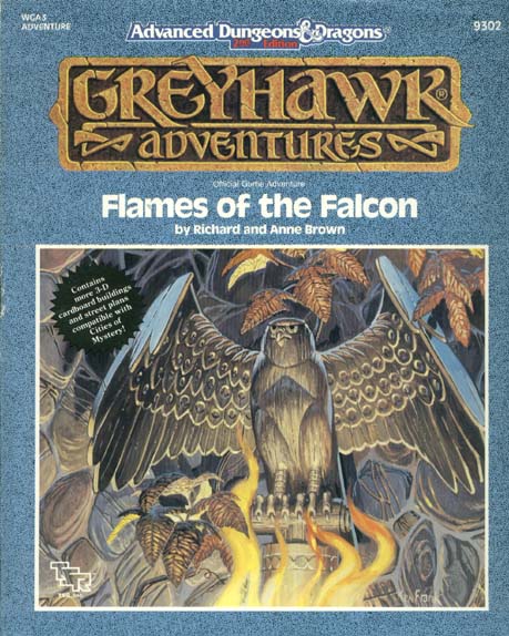 Item Code: #9302 (WGA3) Title: Flames of the Falcon Type: Adventure Author: Richard and Anne Brown Published: 1990 Format: 64-page book w/cover, fold-out map, fold-up cardstock buildings |