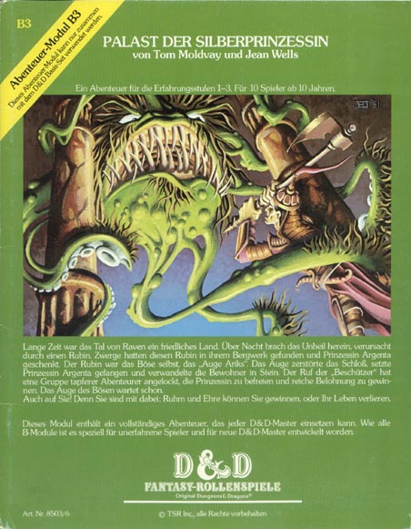 Item Code: #8503/6 (B3) Title: Palast der Silberprinzessin Type: Adventure Author: Tom Moldvay and Jean Wells Published: 1st print - 1981 Format: 36-page book w/cover |