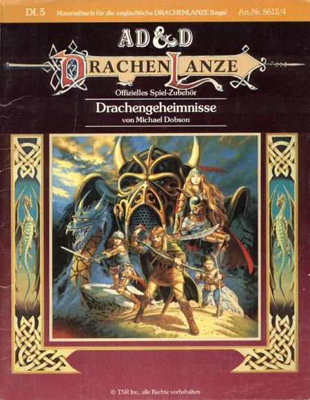 Item Code: #8612/4 (DL5) Title: Drachengeheimnisse Type: Accessory Author: Michael Dobson Published: 1985(?) Format: 36-page book w/cover, fold-out map |