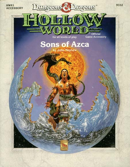 DARKNESS In the Hollow World, one civilization above all others is known as the fiercest, most dangerous race, to be avoided as much as possible: the Azcans. Are they truly cannibals, given to performing sacrifices as entertainment? Is their architecture really some of the most extraordinary in all the Hollow World? Is there any truth to the rumor that there is some connection between the Azcans and the outer world tribes of the Atruaghin Clans? Are there any pleasant qualities about this warrior race? Read the book, and find out for yourself. The HOLLOW WORLD boxed set is required for use with this accessory. This product includes a 64-page DM's booklet with a pullout section especially for players, a 32-page campaign booklet to get you started in an Azcan-centered setting, and a full-color poster map of the Az- can lands. Sons of Azca expands and builds on material presented in the Blood Brethren trilogy of adventures: Nightwail, Nightrage, and Nightstorm. Watch for the second cultural accessory for the HOLLOW WORLD, Kingdom of Nithia, coming this fall! |
