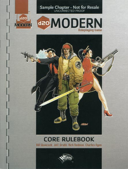Title: d20 Modern Roleplaying Game (Sample Chapter) Type: Core Rulebook (Preview) Author: Bill Slavicsek, Jeff Grubb, Rich Redman, Charles Ryan Published: 2002 Publisher: Wizards of the Coast Format: 28-page book |