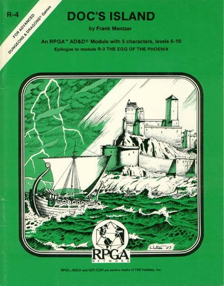 This is the last in the "R" series of AD&D modules. Each RPGA module has been used at an official Gen Con tournament, and has been designed to provide maximum entertainment. Doc's Island is usable in campaign or tournament play. The original five characters are included in the module, along with character details, historical background, overview maps, and detailed encounter descriptions for the Dungeon Master. |